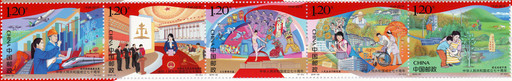 這是原藝珊第一次設(shè)計(jì)政治題材郵票,相比已經(jīng)發(fā)行過的類似題材郵票,將新中國成立70年來特別是近10年來祖國方方面面的變化、成就,濃縮在一套郵票里呈現(xiàn),難度系數(shù)可想而知。對(duì)于這樣一篇嚴(yán)格的“命題作文”,原藝珊根據(jù)完善的前期論證結(jié)果,仔細(xì)研讀責(zé)任編輯提供的具體設(shè)計(jì)要求,明確了設(shè)計(jì)思路,即打破時(shí)空概念,將所有的人物、場(chǎng)景、元素編織起來繪成一幅長卷,設(shè)計(jì)成連票,用壁畫的構(gòu)圖最為合適。