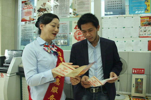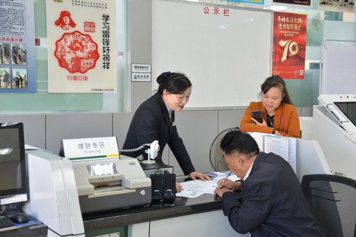 顧朝竹悉心為客戶辦理財(cái)產(chǎn)品購(gòu)買登記手續(xù)。