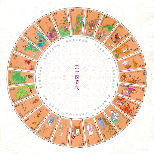 王虎鳴在小全張邊飾設(shè)計(jì)上使用了中國(guó)古代數(shù)學(xué)、天文學(xué)著作中的元素,包含日、月、星斗、算酬、古人描繪的天與地關(guān)系圖、紫微垣以及古星圖等。這些元素描繪了中國(guó)古人如何通過(guò)觀察自然來(lái)確定二十四節(jié)氣,從事農(nóng)業(yè)生產(chǎn)和生活。郵票中心的圓中將太極、地支、黃道度數(shù)與二十四節(jié)氣的對(duì)應(yīng)關(guān)系進(jìn)行了展現(xiàn),進(jìn)一步闡明了中國(guó)傳統(tǒng)文化的博大精深和相互聯(lián)系,也表達(dá)了中華民族一直以來(lái)注重人與自然的關(guān)系,講究天人合一的思想。