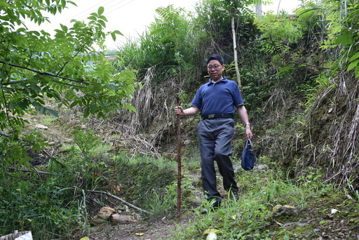 走訪貧困戶遇到山路陡峭時,陳澤維用樹枝作拐杖。