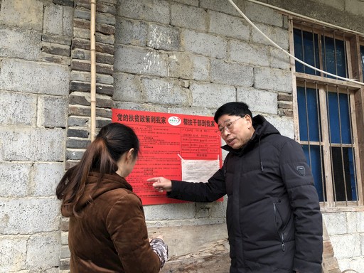 陳澤維向6組貧困戶龐召華的妻子詳細(xì)講解可享受的低保、教育資助、危房改造補貼、無障礙廁所改造、免交合作醫(yī)療費用等扶貧保障政策。在布袋溪村,每家貧困戶門前都張貼著“扶貧干部到我家”的公示牌。