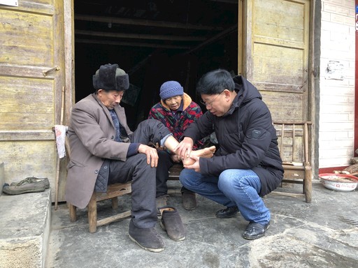 聽說貧困戶胡洋朋腳扭傷后,陳澤維到他家看望。胡洋朋像看到自家人一樣伸出腳讓陳澤維查看傷勢。