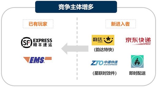 參與主體增多。京東開放個人寄件服務(wù),通達(dá)系打造直營標(biāo)快品牌,此外,即時配送強(qiáng)勢沖擊同城時效快遞,既有競爭格局面臨更多變數(shù)。(見圖3)