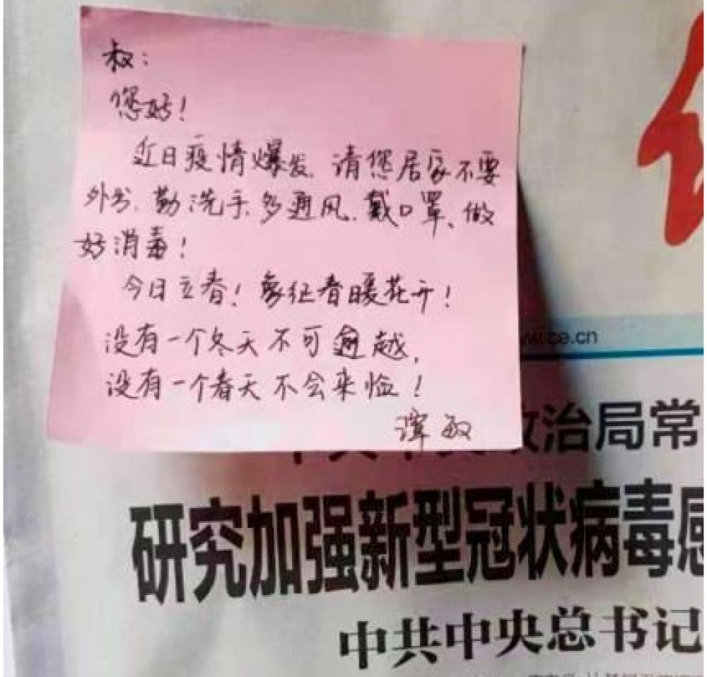 2月4日,正值立春節(jié)氣。在這個(gè)充滿(mǎn)希望的日子,譚敏寫(xiě)下了一張張滿(mǎn)懷關(guān)切的“防疫小紙條”,叮囑用戶(hù)們做好自身防護(hù),注意身體健康,要相信“沒(méi)有一個(gè)冬天不可逾越,沒(méi)有一個(gè)春天不會(huì)來(lái)臨”。當(dāng)天下午,客戶(hù)李先生在取報(bào)紙時(shí),看到了貼在報(bào)紙上的小紙條。他立即給譚敏打電話(huà)說(shuō):“小譚,你的囑咐我收到了,我和你阿姨很好,謝謝!你每天外出工作,一定要注意安全!”話(huà)音未落,譚敏已淚目。