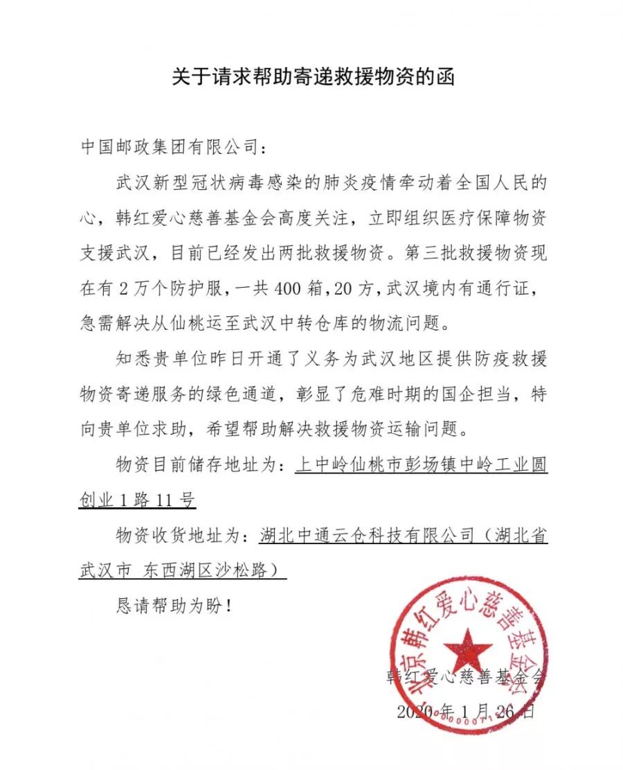 1月26日22時,湖北郵政收到由中國郵政集團有限公司轉(zhuǎn)發(fā),由北京韓紅愛心慈善基金會寄出的《關(guān)于請求幫助寄遞救援物資的函》。