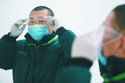 出發(fā)前,侯毅在衣冠鏡前整理著裝并檢查自己的個人防護裝備是否佩戴到位。