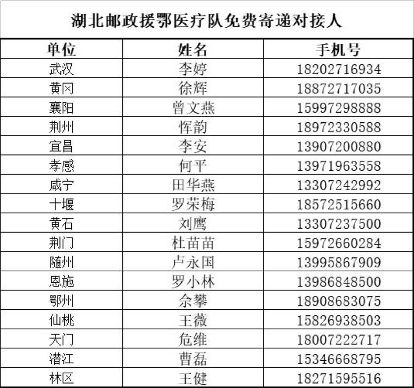 此次援鄂醫(yī)護(hù)人員個(gè)人物資免費(fèi)寄遞由黃岡市郵政分公司在湖北省率先開(kāi)展,為山東和湖南援鄂醫(yī)療隊(duì)免費(fèi)收寄個(gè)人物資1200多件,受到了醫(yī)療隊(duì)員們的一致好評(píng)。而武漢作為此次全國(guó)疫情防控阻擊戰(zhàn)的重中之重,也是外省醫(yī)療隊(duì)援助的重點(diǎn),醫(yī)療隊(duì)員個(gè)人物品寄遞需求也最為迫切。武漢市郵政分公司第一時(shí)間對(duì)外發(fā)布公告,凡駐武漢市行政轄區(qū)內(nèi)的外省各級(jí)醫(yī)療服務(wù)隊(duì)員,均可通過(guò)聯(lián)系指定郵政工作人員的方式,由武漢市郵政分公司提供上門攬收服務(wù),免費(fèi)寄遞相關(guān)郵件。該分公司還成立了援鄂醫(yī)療隊(duì)個(gè)人物資免費(fèi)寄遞專班,積極與市防疫指揮部聯(lián)系,宣傳開(kāi)展免費(fèi)寄遞服務(wù)。