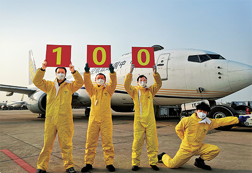 3月21日,郵航CF9016航班于7點19分飛抵武漢天河機場,飛行員在機場擺起pose,慶祝中國郵政航空執(zhí)飛疫區(qū)航班100架次這一榮耀時刻。