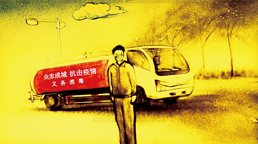 記者又問陳娜,知道他給消毒車隊(duì)捐了20桶消毒液嗎?陳娜搖搖頭說,他不講,但是我支持他。于是,她用自己的一技之長為他畫了一幅沙畫,名字就叫《消毒送安全 郵件送希望》。