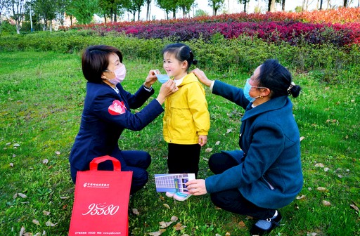 3月20日,郵儲(chǔ)銀行安徽省金寨縣支行在“郵愛(ài)公益日”設(shè)立三周年之際,開(kāi)展宣傳活動(dòng)。在疫情防控期間,該支行創(chuàng)新舉措,讓宣傳活動(dòng)、疫情防控及文明創(chuàng)建相結(jié)合,將企業(yè)品牌宣傳與踐行社會(huì)責(zé)任深度融合。圖為該支行宣傳人員在公園執(zhí)勤點(diǎn)向居民介紹“郵愛(ài)公益”時(shí),為小朋友戴上防護(hù)口罩?! 趵蠲?nbsp; 攝影報(bào)道