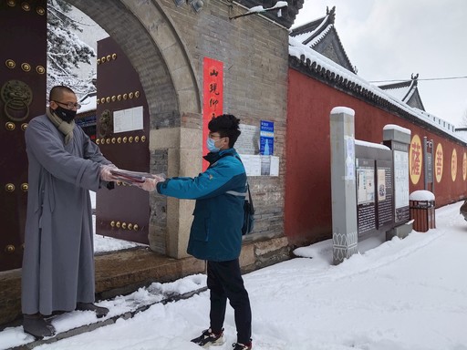 接下來,高健喻到了第二個投遞點(diǎn)——善財洞。由于疫情防控期間寺院實(shí)行封閉管理,到了寺院門口后,小高撥通客堂師父釋仁恒的電話,告知郵件來了。很快,釋仁恒打開厚重的寺門接過報紙說:“小高,這么大的雪你還過來了?每天看看你送來的報紙,了解天下大事,對我們也是一種很好的修行。”