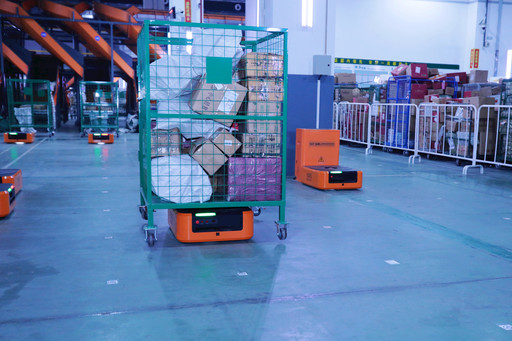 在疫情期間,智能搬運(yùn)機(jī)器人(AGV)成了北京郵區(qū)中心局重件作業(yè)區(qū)郵件盤駁工作的主力。鐘山 攝
