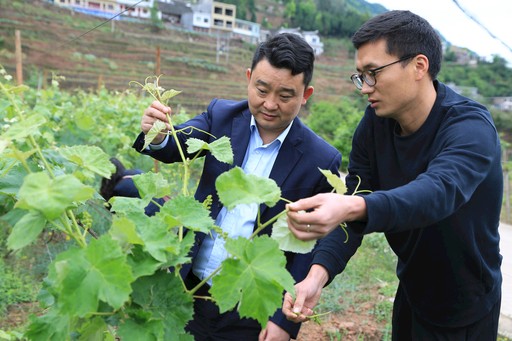 郵儲(chǔ)銀行貴州省畢節(jié)市分行今年協(xié)同畢節(jié)市郵政分公司,全力加強(qiáng)市級(jí)及以上專業(yè)合作社、家庭農(nóng)場(chǎng)走訪,以惠農(nóng)項(xiàng)目為抓手,助力決勝脫貧攻堅(jiān)。截至4月底,該分行已發(fā)放金融精準(zhǔn)扶貧貸款近1.8億元,其中發(fā)放個(gè)人精準(zhǔn)扶貧貸款1400多萬元,直接支持建檔立卡貧困戶175戶。圖為郵儲(chǔ)銀行畢節(jié)市七星關(guān)區(qū)支行負(fù)責(zé)人(左一)走訪專業(yè)合作社查看葡萄長(zhǎng)勢(shì)?! 跆K勇 攝影報(bào)道