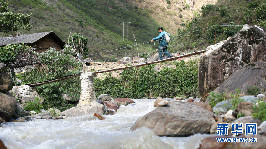 桑南才送郵件途中經(jīng)過獨(dú)木橋(5月10日攝)。新華網(wǎng) 劉東 攝