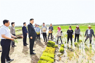 在黃河水滋養(yǎng)下,寧夏平原土地肥沃、物產(chǎn)豐富,素有“塞上江南”之稱。9日下午,習(xí)近平來(lái)到銀川市賀蘭縣稻漁空間鄉(xiāng)村生態(tài)觀光園,聽(tīng)取寧夏現(xiàn)代農(nóng)業(yè)發(fā)展、農(nóng)業(yè)合作社帶動(dòng)農(nóng)民增收致富運(yùn)營(yíng)模式等情況匯報(bào),觀看寧夏特色農(nóng)產(chǎn)品展示,了解稻漁種養(yǎng)業(yè)融合發(fā)展的創(chuàng)新做法。習(xí)近平登上觀景塔,俯瞰園區(qū)全貌。微風(fēng)輕拂,秧苗搖曳,一派生機(jī)勃勃。他沿著田埂走進(jìn)稻田,同正在勞作的村民們親切交談。村民們告訴總書記,現(xiàn)在有土地流轉(zhuǎn)費(fèi)、勞務(wù)費(fèi),還有年底分紅,收入提高了,也有保障了。正值放魚時(shí)節(jié),習(xí)近平舀起魚苗、蟹苗,放進(jìn)田邊水渠。習(xí)近平強(qiáng)調(diào),發(fā)展現(xiàn)代特色農(nóng)業(yè)和文化旅游業(yè),必須貫徹以人民為中心的發(fā)展思想,突出農(nóng)民主體地位,把保障農(nóng)民利益放在第一位。要探索建立更加有效、更加長(zhǎng)效的利益聯(lián)結(jié)機(jī)制,確保鄉(xiāng)親們持續(xù)獲益。要注意解決好稻水矛盾,采用節(jié)水技術(shù),積極發(fā)展節(jié)水型、高附加值的種養(yǎng)業(yè),保護(hù)好黃河水資源。目前,疫情防控形勢(shì)穩(wěn)步向好,要繼續(xù)抓好常態(tài)化疫情防控,加快恢復(fù)社會(huì)生產(chǎn)生活正常秩序。