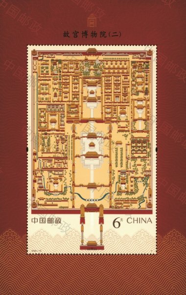 紫禁城建造技藝高超,內(nèi)在考究精妙,外在磅礴大氣,代表著當(dāng)時最高的建造水平。中央軸線上分布著三大殿(太和殿、中和殿以及保和殿)和后三宮(乾清宮、交泰殿以及坤寧宮),左右兩條次軸線上分別分布著慈壽宮、寧壽宮等宮殿。出于防御需要,宮殿建筑外圍筑有宮墻,四周分布有角樓,外有護城河環(huán)繞。故宮平面示意圖首次登上郵票,細(xì)膩、完整地呈現(xiàn)了故宮恢弘的建筑布局。