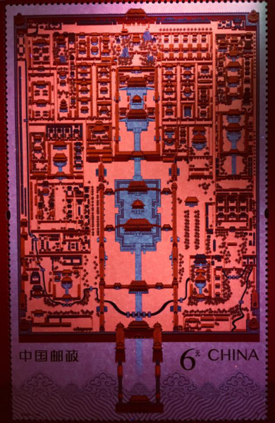 小型張采用特種金油墨印制紋飾圖案,烘托故宮的尊貴大氣。在故宮平面示意圖中的地面部分,專門覆蓋了一層無色變金色珠光油墨和熒光油墨,在特定光照和角度下觀看,地面與建筑層次分明。