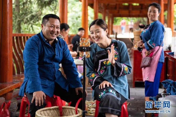 在湘西十八洞村,十八洞村扶貧隊(duì)長麻輝煌(左)與返鄉(xiāng)大學(xué)生施林嬌(中)一起直播推銷土特產(chǎn)(5月15日攝)。 新華社記者 陳思汗 攝