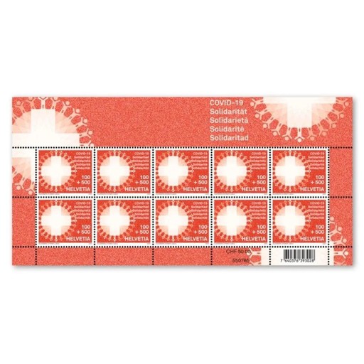 4月6日,瑞士郵政發(fā)行抗擊疫情附捐郵票,全套1枚。郵票面值1法郎,附捐5法郎,按照5法郎出售,表明瑞士郵政提供無償服務(wù)。這是第一套抗擊疫情附捐郵票。郵票圖案表達(dá)了瑞士民眾攜手抗疫的決心,捐款所得全數(shù)交瑞士團(tuán)結(jié)基金會和瑞士紅十字會用于應(yīng)對疫情,郵票以全張為單位在瑞士郵政官網(wǎng)出售。