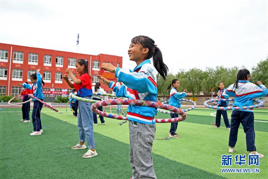 寧夏吳忠市紅寺堡區(qū)紅寺堡中心小學學生在體育課上練習呼啦圈(7月3日攝)。 新華社記者 賈浩成 攝