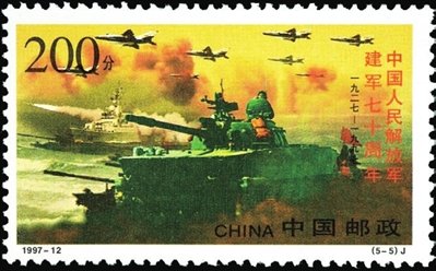 1997年8月1日,中國郵政發(fā)行了1997-12《中國人民解放軍建軍七十周年》紀(jì)念郵票1套5枚,票名分別是“陸軍”“海軍”“空軍”“戰(zhàn)略導(dǎo)彈部隊(duì)”和“陸??章?lián)合演習(xí)”5枚郵票,以陸、海、空和戰(zhàn)略導(dǎo)彈部隊(duì)的主戰(zhàn)兵器為主圖,背景是按兵種按時(shí)間有機(jī)串聯(lián)在一條主線上的建軍七十年來的重大事件,淡彩的背景與重彩的主圖珠聯(lián)璧合,能夠讓人自然重溫人民解放軍七十年的成長歷程,真切感受人民軍隊(duì)的現(xiàn)代化步伐。每幅畫面雖沒有出現(xiàn)一個(gè)軍人形象,但那隆隆開進(jìn)的坦克、劈波斬浪的軍艦、呼嘯而過的戰(zhàn)機(jī)和騰空而起的導(dǎo)彈,創(chuàng)造了一種千軍萬馬奔騰向前的氣勢(shì),表現(xiàn)出現(xiàn)代化戰(zhàn)爭(zhēng)操縱著現(xiàn)代武器與敵人決戰(zhàn)千里之外的新特點(diǎn),收到了此處無人勝有人的藝術(shù)效果。