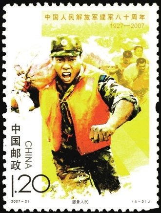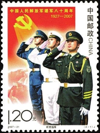 2007年8月1日發(fā)行2007-21《中國人民解放軍建軍八十周年》紀(jì)念郵票1套4枚,畫面生動(dòng)表現(xiàn)了中國人民解放軍在黨的領(lǐng)導(dǎo)下,發(fā)揚(yáng)聽黨指揮、服務(wù)人民、英勇善戰(zhàn)的優(yōu)良傳統(tǒng),刻苦訓(xùn)練、抗洪搶險(xiǎn),參與聯(lián)合國維和行動(dòng),用忠誠和熱血捍衛(wèi)國家主權(quán)和安全,筑起共和國的鋼鐵長城,集中反映出軍隊(duì)建設(shè)的新成就和我軍忠實(shí)履行歷史使命的時(shí)代風(fēng)采。