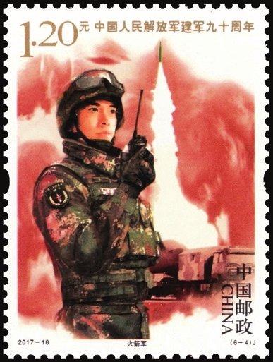 2017年8月1日中國郵政發(fā)行了2017-18《中國人民解放軍建軍九十周年》紀(jì)念郵票1套6枚,小型張1枚。圖案內(nèi)容分別為:陸軍、海軍、空軍、火箭軍、戰(zhàn)略支援部隊(duì)、武裝警察部隊(duì),小型張內(nèi)容為聽黨指揮。該套郵票展現(xiàn)了中國人民解放軍的颯爽英姿和中國軍事作戰(zhàn)裝備的硬件實(shí)力,主題鮮明,磅礴大氣,畫面具有強(qiáng)烈的動(dòng)感和威嚴(yán)的氣勢(shì)。小型張上軍旗飄揚(yáng),各軍種英姿颯爽,背景襯托各軍種高尖端裝備,描繪了我軍戰(zhàn)士聯(lián)合作戰(zhàn)的畫面,既表現(xiàn)了中國人民解放軍威武雄壯的軍容和現(xiàn)代化水平,也體現(xiàn)出黨的十八大以來,人民軍隊(duì)在新時(shí)代強(qiáng)軍目標(biāo)指引下所取得的巨大成就。