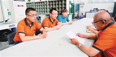 葛軍(右)與伙伴們一起學(xué)習(xí)、研討業(yè)務(wù)。