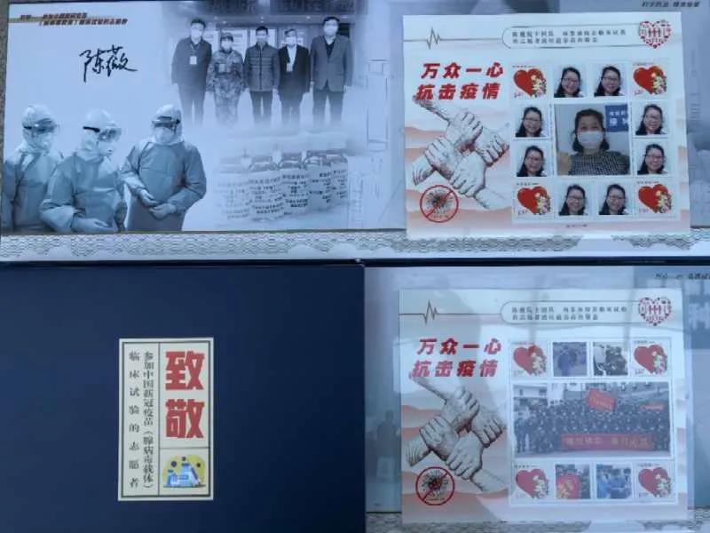 在陳薇院士和團隊成員張振威主任、邵龍飛教授以及郵政工作人員的共同努力下,武漢市分公司先后為參加重組新冠疫苗I期、Ⅱ期臨床試驗的志愿者設計制作了2000套紀念品,均在第一時間送往陳薇團隊駐地,讓這份心意能最快地到達志愿者手中,傳遞到他們心里。