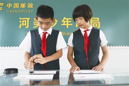 圖為少年郵局的營業(yè)員在蓋郵戳。