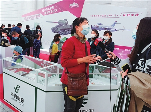 圖為北京郵政在中國人民革命軍事博物館設(shè)立的臨時(shí)郵局內(nèi),郵迷們積極選購郵品并接受媒體采訪。