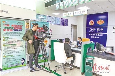 圖為中央電視臺記者在市郵政分公司龍源湖郵政支局采訪“稅郵雙代”業(yè)務。王成 攝