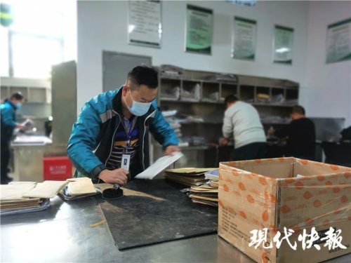 12月8日上午9點(diǎn),現(xiàn)代快報(bào)記者走進(jìn)宿遷市郵政城區(qū)分公司時(shí),李元明正忙著給一批已經(jīng)分類好的郵件和包裹蓋上郵戳?!芭九九九尽彪S著一聲聲脆響,摞得小山一樣高的包裹很快就被處理好,速度快得像是開(kāi)了三倍速一般。