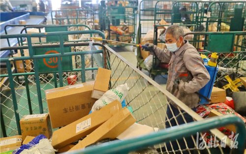 2021年1月7日,位于河北省秦皇島市海港區(qū)臨港物流園區(qū)的中國郵政集團有限公司秦皇島市分公司網(wǎng)路運營中心內(nèi),工作人員在對快遞包裹進行消殺。