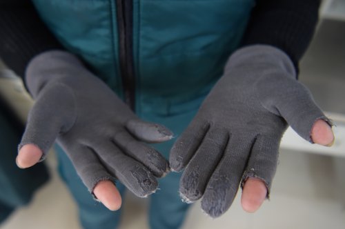每天上午八點(diǎn)半,韓金花就開始工作,要一直忙碌到天黑。為了御寒,韓金花提前準(zhǔn)備了暖足貼,外出工作時(shí)貼到腳上。她在手套的拇指與食指部分剪了洞,露出手指,方便在設(shè)備中錄入快遞信息。寒冬里,手指經(jīng)常凍得失去知覺?!敖衲?0月份我就要退休了,我要站好最后一班崗?!彼f。