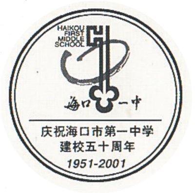 2001年4月10日,海口市集郵公司特發(fā)行了紀(jì)念封一枚。紀(jì)念封貼用“邁入新世紀(jì)”郵票,封圖印有校慶主題、時(shí)任校長題詞,貼票的下方還以素色印制了校慶紀(jì)念主圖,構(gòu)圖為該校的“金鑰匙”?;?,金鑰匙下方簡寫校名“??谝恢小钡淖謽?,取自郭沫若先生為該校題寫的校名。