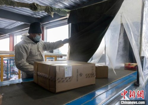 工作人員手持噴霧器對快遞郵件進(jìn)行消殺。 楊迪 攝