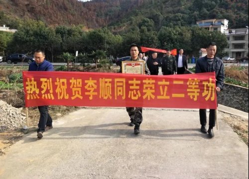 現(xiàn)場(chǎng)為立功軍人豎起大幅海報(bào)