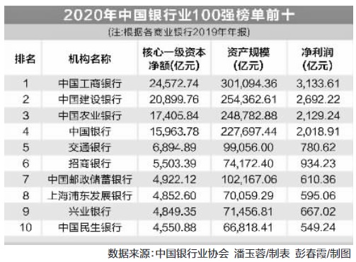 中國銀行業(yè)協(xié)會最新一期“中國銀行業(yè)100強(qiáng)榜單”出爐。2020年榜單前十名的銀行分別是:工商銀行、建設(shè)銀行、農(nóng)業(yè)銀行、中國銀行、交通銀行、招商銀行、郵儲銀行、浦發(fā)銀行、興業(yè)銀行及民生銀行。