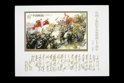 2006年10月22日,《中國工農(nóng)紅軍長征勝利70周年》紀念郵票發(fā)行。郵票內(nèi)容分別為《送別》《遵義會議》《飛奪瀘定橋》《過草地》,小型張則以國畫《大會師》為主題圖案。