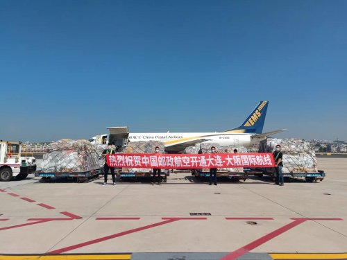 9月14日的大連周水子國際機場秋高氣爽,12點29分,一架垂直尾翼上噴涂著EMS、航班號為CF241的波音737飛機從這里起飛,14點15分在小雨中安全飛抵日本大阪關(guān)西國際機場,標(biāo)志著中國郵政“大連—大阪”國際航線正式開通。