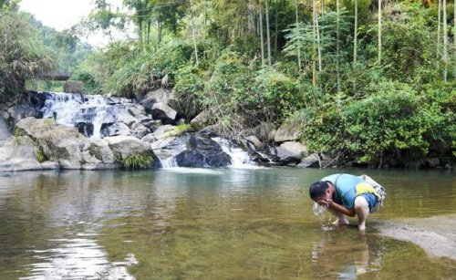 9月28日,送貨途中,雙峰郵政所的郵遞員吳文清用山間的溪水洗臉。