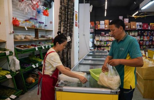 9月28日,雙峰郵政所的郵遞員吳文清(右)在雙峰鎮(zhèn)一家超市選購村民需要的物品。
