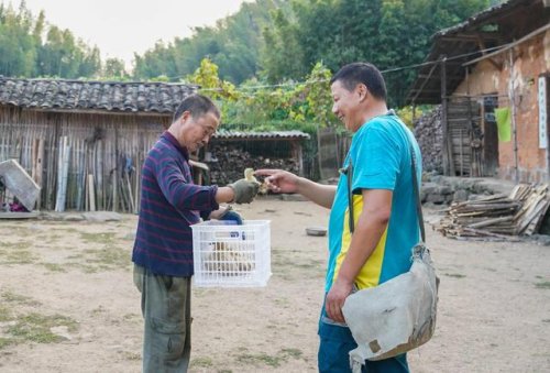 9月28日,雙峰郵政所的郵遞員吳文清(右)將鴨幼崽送至村民手中。