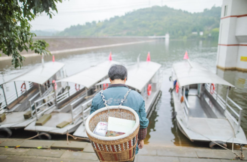重慶大足區(qū)化龍湖上冷風(fēng)颼颼,空無一人。郵遞員黃曉利,背著滿滿一背簍的包裹來到碼頭,成為今天的第一位船客。