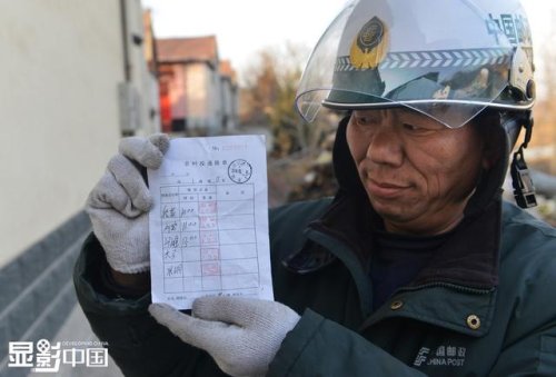 在他的這條郵路上,有5個郵政排單的蓋章點,他每天都會認認真真的蓋完。圖為董乃軍在張家洞村展示已經蓋完印章的排單。