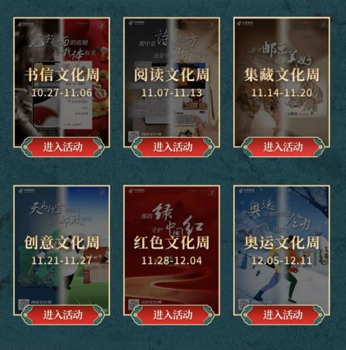 首屆“中國郵政·文化季”主題是“給你我不一樣的冬天”。通過開展書信、閱讀、集藏、創(chuàng)意、紅色和奧運(yùn)六大文化主題活動(dòng),讓廣大用戶享受這一文化盛宴。文化季歷時(shí)3個(gè)月,將利用數(shù)字科技手段,組織“精品書刊免費(fèi)讀”“郵票直播”“趣寫信”“中國郵政文創(chuàng)大賽”等活動(dòng),通過對(duì)傳統(tǒng)文化的傳承與創(chuàng)新,讓中國優(yōu)秀文化走進(jìn)大眾。