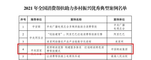 12月2日,在國家發(fā)改委召開的2021年全國消費幫扶助力鄉(xiāng)村振興典型案例視頻推介會上,54家單位獲評2021年全國消費幫扶助力鄉(xiāng)村振興優(yōu)秀典型案例,中國郵政榮膺其中。