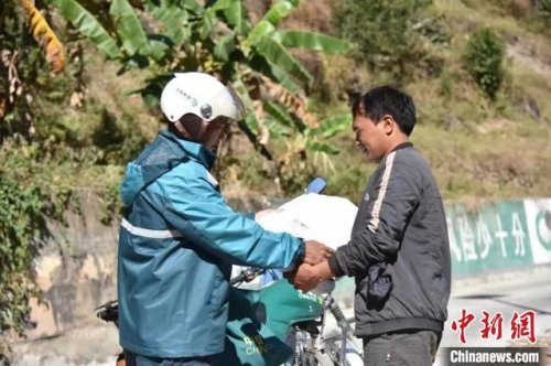 圖為桑南才給收件人送件。桑南才供圖