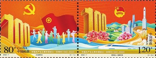 該套郵票一套2枚,分別為《永遠(yuǎn)跟黨走》和《請黨放心強(qiáng)國有我》?!队肋h(yuǎn)跟黨走》以黨徽與團(tuán)旗為主體,團(tuán)旗緊緊跟隨著黨徽,輔以數(shù)字“100”及奮斗在各行各業(yè)的青年群像剪影,突出共青團(tuán)緊跟黨走的政治定位?!墩堻h放心強(qiáng)國有我》以共青團(tuán)團(tuán)徽為主體,輔以數(shù)字“100”、高鐵、火箭、樓宇等畫面內(nèi)容,寓意廣大共青團(tuán)員為建設(shè)繁榮祖國、實(shí)現(xiàn)中華民族偉大復(fù)興貢獻(xiàn)青春力量的壯志豪情。